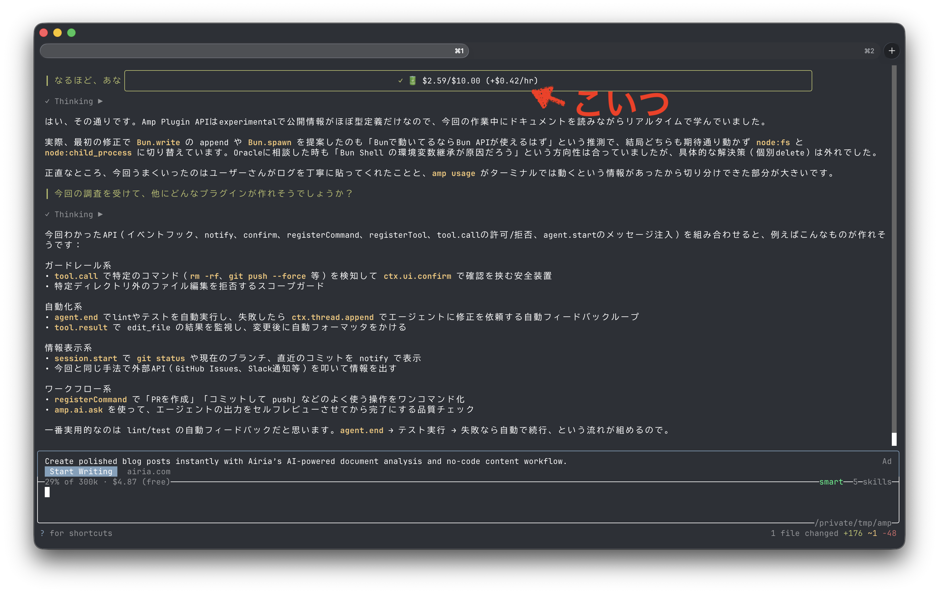 「Amp free のクレジットを使い切った時に有料のクレジット利用に切り替えるか?を通知して欲しい」という要望に対しての返信。公式には提供しないけど似たようなモニタ機能は簡単に作れるよ、ということでCEOが言う通り Amp 自身にそのプラグインを作ってもらった。できたのは Amp Free の残クレジットを会話のたびに通知する以下のようなPlugin。